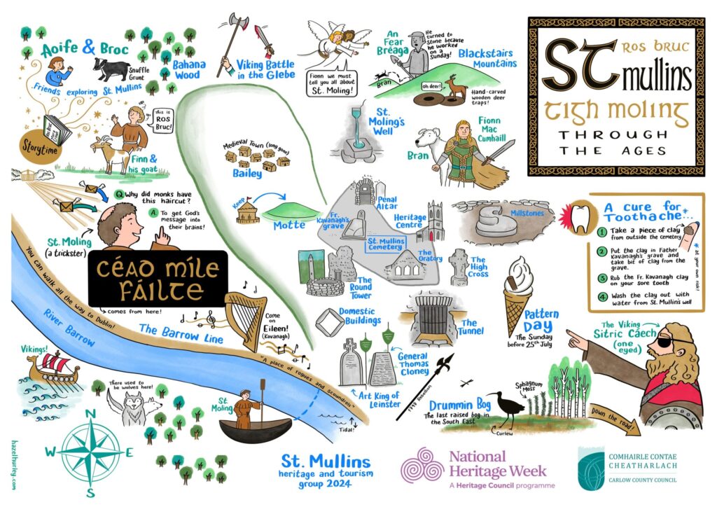 According to tradition, the history of St. Mullins stretches back even further, with connections to Fionn Mac Cumhail. It is said that Fionn stopped here to consolidate his followers on his way north to battle.