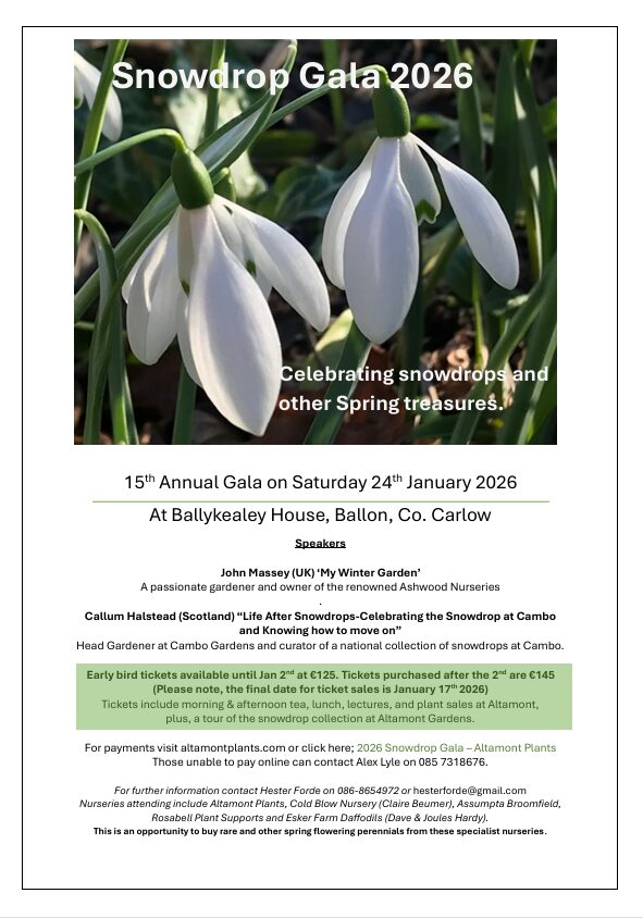 Tickets include morning and afternoon tea, lunch, lectures and a special plant sales at Altamont Plants open only to those with gala tickets. Nurseries attending include Altamont Plants, Cold Blow Nursery (Claire Beumer), Assumpta Broomfield, Rosabell Plant Supports and Esker Farm Daffodils (Dave & Joules Hardy).