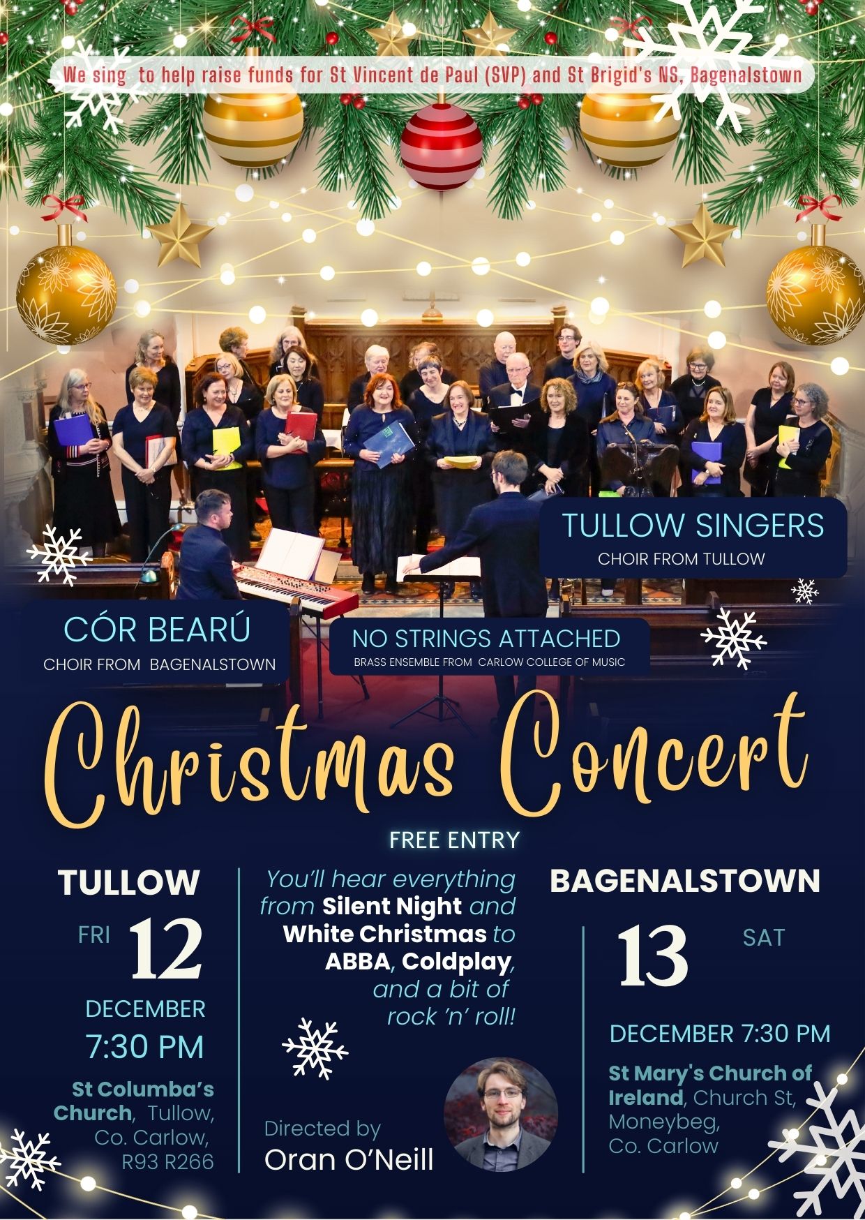 You will hear everything from Silent Night, White Christmas ABBA, & Coldplay with a bit of rock & Roll., Directed by Oran O’Neill, accompanied with the following