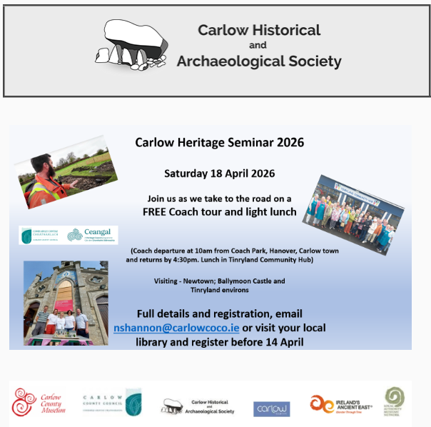 A fantastic opportunity to experience and explore the rich heritage of Carlow takes place on Saturday, April 18th as part of the Carlow Heritage Seminar 2026.