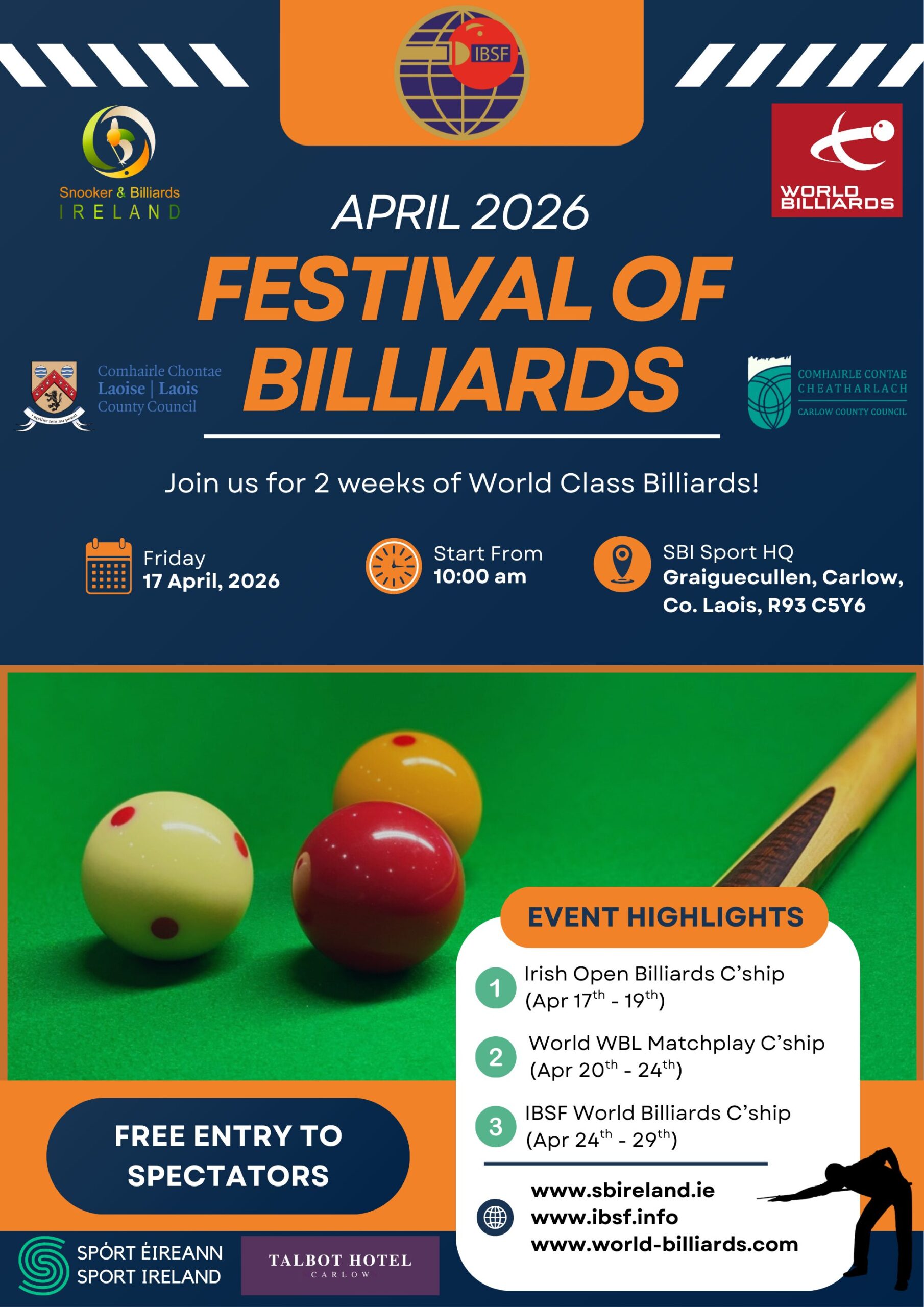 Both WBL and IBSF are pleased to announce that a true Festival of Billiards is coming to the Snooker Billiards Ireland Academy of excellence in 2026.