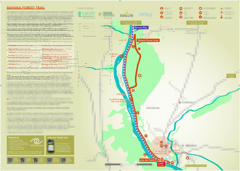 Bahana Forest takes its name from the Irish word for ‘Beitheanna’, meaning a place of birch trees. This route covers a distance of 4.5km along forest tracks and the River Barrow towpath, one of the great ancient highways of Ireland’s Ancient East. From its starting point on the quayside in St. Mullins, take the towpath for approximately 15 minutes, before following a canal away from the river to reach St. Mullins Sea Lock – the river is tidal up to this point.