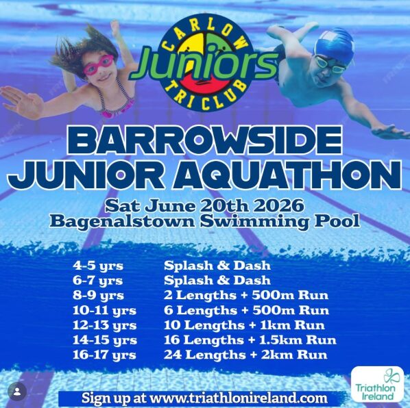 Enjoy a fun-filled day of swimming, running and big smiles at the Barrowside Junior Aquathon on Saturday June 20th, 2026 in Bagenalstown Swimming Pool.